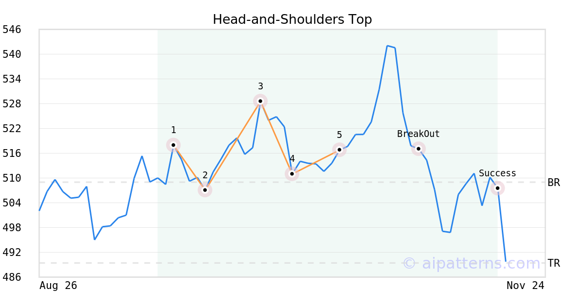On October 20, 2025, A.I.dvisor detected a Head-and-Shoulders Top Pattern (Bearish) for Microsoft Corp (MSFT, $516.79). 14 days later, on November 03, 2025, A.I.dvisor confirmed the Bearish pattern, setting a target price of the stock. On November 17, 2025, the stock hit the target price of $489.42 – resulting in a gain for traders who shorted the stock on the pattern detection date.