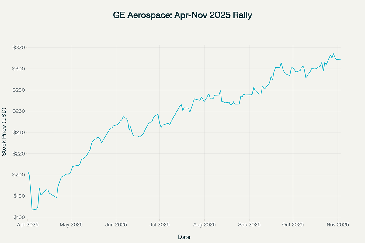 GE Aerospace has delivered one of the industrial sector's most compelling performances in 2025, surging 93.66% from the April 7 low of $159.36 to the November 3 closing price of $308.62, while establishing all-time highs of $316.67 in late October. This remarkable rally reflects genuine operational excellence grounded in robust commercial aviation recovery, expanding defense contracts, and strategic supply chain improvements translating into record profitability. With a market capitalization of approximately $325.5 billion, GE Aerospace has become one of the most compelling aerospace plays globally, capturing the convergence of strong commercial demand and elevated defense spending.