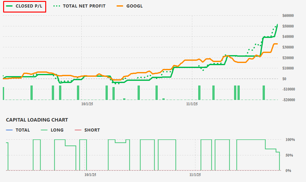 Single Ticker Agent (GGLL): Generated a remarkable +595% annualized return over 77 days, producing $51,353 in closed-trade profit, using 200% daily leveraged exposure to GOOGL for magnified gains.