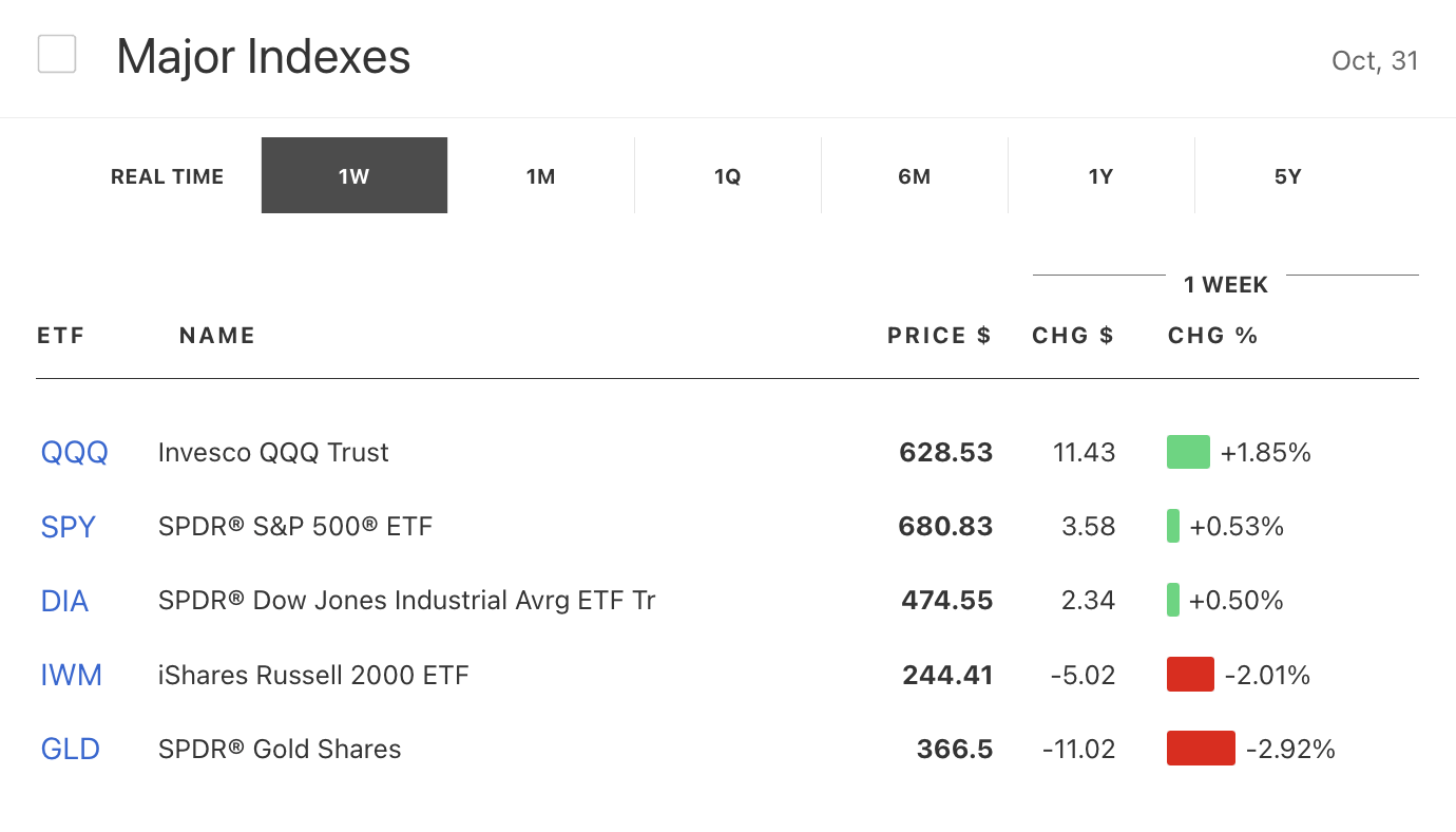 Market Indices: The SPY reached multiple record highs during the week, notably surpassing 6,875 on Monday and continuing its advance with strong momentum despite Fed-induced volatility. The QQQ demonstrated remarkable strength, surging 1.9% early in the week as traders anticipated big tech earnings and the Fed decision. However, this enthusiasm faced headwinds after Powell's October 29 statement suggested December rate cuts were far from certain, causing the DIA to turn negative following the announcement. By week's end, the indices had largely recovered, with the S&P 500 approaching 6,900 and the Nasdaq and Dow gaining modest ground. The IWM (Russell 2000) demonstrated tentative catch-up strength early in the week as small-caps began to participate in the rally, though momentum varied as macro uncertainty increased.