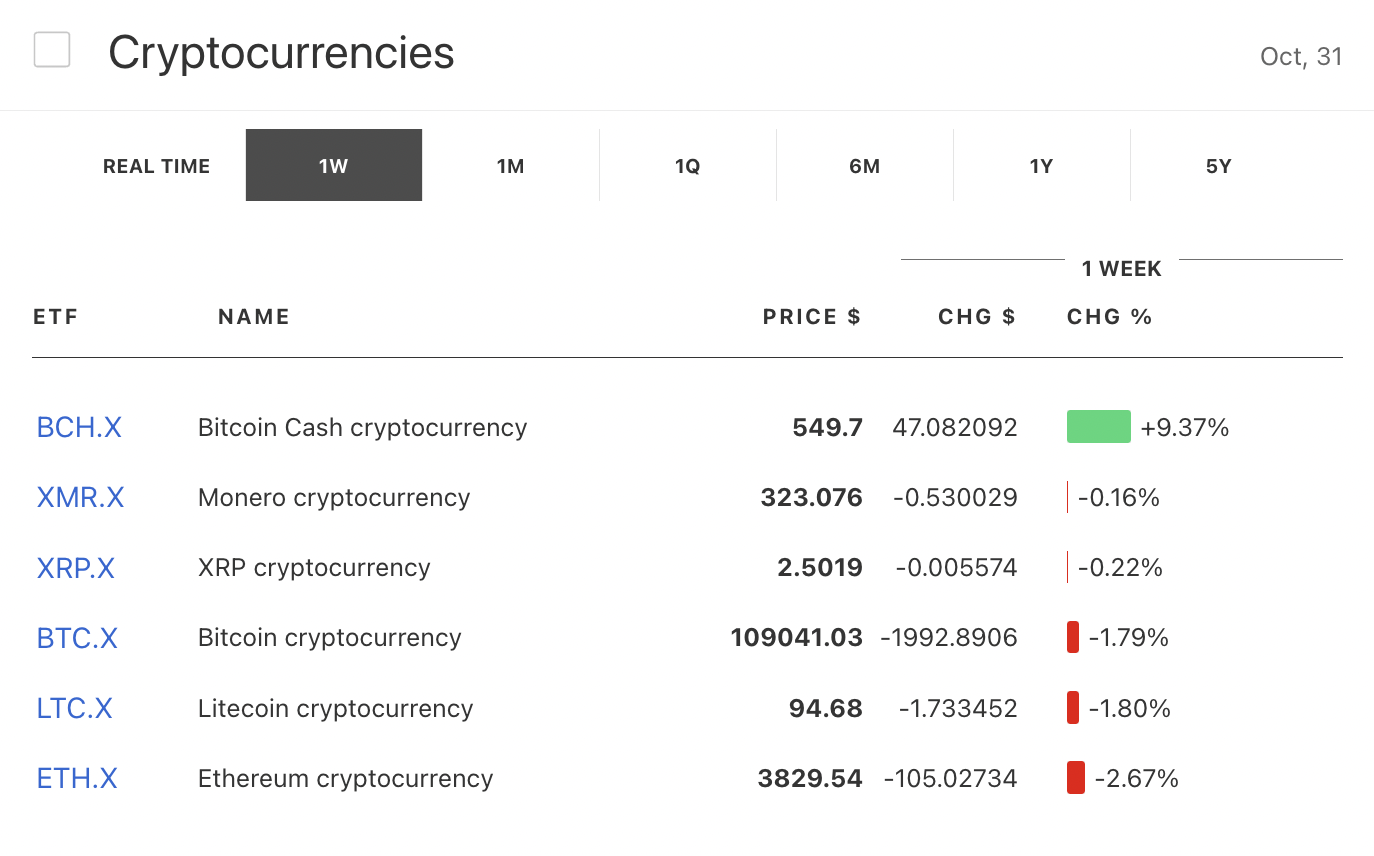 Bitcoin (BTC.X): Cryptocurrency prices showed resilience during the week despite broader equity market volatility. Bitcoin remained in the $100,000+ range, supported by expectations for eventual rate cuts and risk-on sentiment from strong tech earnings. The digital asset demonstrated correlation with equities as market risk sentiment fluctuated.